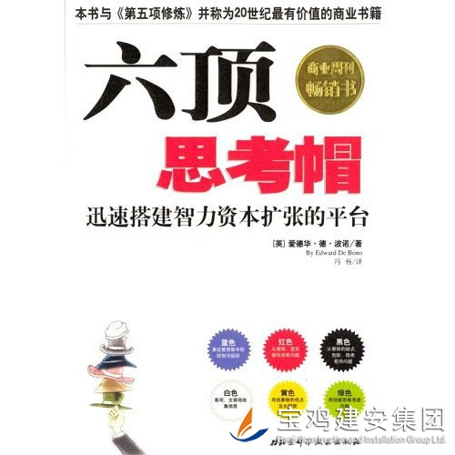 《六頂思考帽》是著名的英國(guó)創(chuàng)新思維家愛(ài)德華.德.博諾的作品,它通過(guò)六種不同顏色詮釋了六種不同的觀點(diǎn)。六頂分別是每個(gè)人都認(rèn)識(shí):藍(lán)、白、紅、黃、黑、綠這六種不同的顏色,之所以叫思考帽,是形象地讓人更容易理解和接受,也能夠想象到自己戴上或摘下不同顏色帽子的感受。 藍(lán)帽:觀察和管理思考。藍(lán)帽負(fù)責(zé)控制各種思考帽的使用順序,它規(guī)劃和管理整個(gè)思考過(guò)程,并負(fù)責(zé)做出結(jié)論。