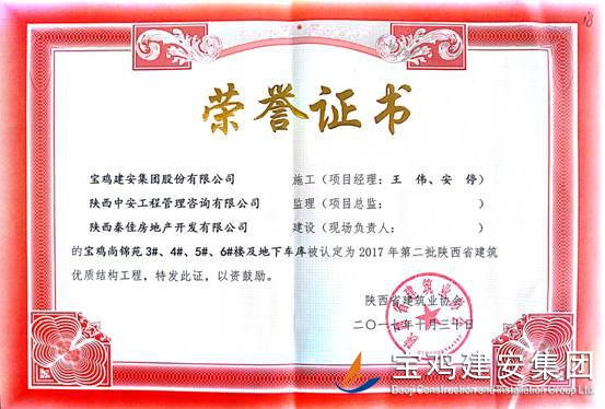 2018年1月26日從陜西省建筑業(yè)協(xié)會傳來喜訊,由寶雞建安集團股份有限公司負責施工的“科技研發(fā)樓工程”(五項目部)、“泰森?千禧時代商業(yè)綜合體”(六項目部)、“寶雞尚錦苑1#、2#樓”、“寶雞尚錦苑3#、4#、5#、6#樓及地下車庫”及“太白縣城市綜合體項目—酒店及球館工程”(路橋項目部)被陜西省建筑業(yè)協(xié)會評為2017年第二批陜西省優(yōu)質(zhì)結(jié)構(gòu)工程獎。 通過本次獲獎,各項目部能夠依據(jù)項目創(chuàng)優(yōu)要求和相關(guān)法律法規(guī)開展質(zhì)量創(chuàng)優(yōu)工作,對現(xiàn)場原材料、檢驗批、分部、分項工程及功能性設(shè)施進行質(zhì)量管理,做好“三檢”工作,切實履行了質(zhì)量管理職責。在施工過程中,公司加強對項目實體質(zhì)量和資料的檢查監(jiān)督,推行質(zhì)量標準化,確保了每一項工程都能順利驗收通過。 希望各項目部在2018年應夠繼續(xù)加強現(xiàn)場質(zhì)量意識,提升項目質(zhì)量管理水平。質(zhì)量部也將繼續(xù)總結(jié)獲獎工程的典型引路和示范作用經(jīng)驗,強化工程建設(shè)質(zhì)量管理,多出精品,推動公司總體水平穩(wěn)步提高。